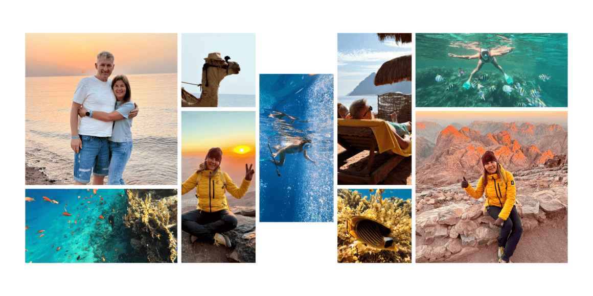 Było snorklowanie w miejscach, gdzie ryby mają więcej kolorów niż niejeden bazar 🎨 Było pływanie, leżenie, patrzenie w horyzont i to błogie „nic nie muszę”. A gdy przyszła pora na coś więcej — nocne wyjście i wschód słońca na Górze Synaj, w ciszy, chłodzie i absolutnym skupieniu. Ten moment, kiedy pierwsze światło dotyka gór, zostaje w głowie na długo 🌄